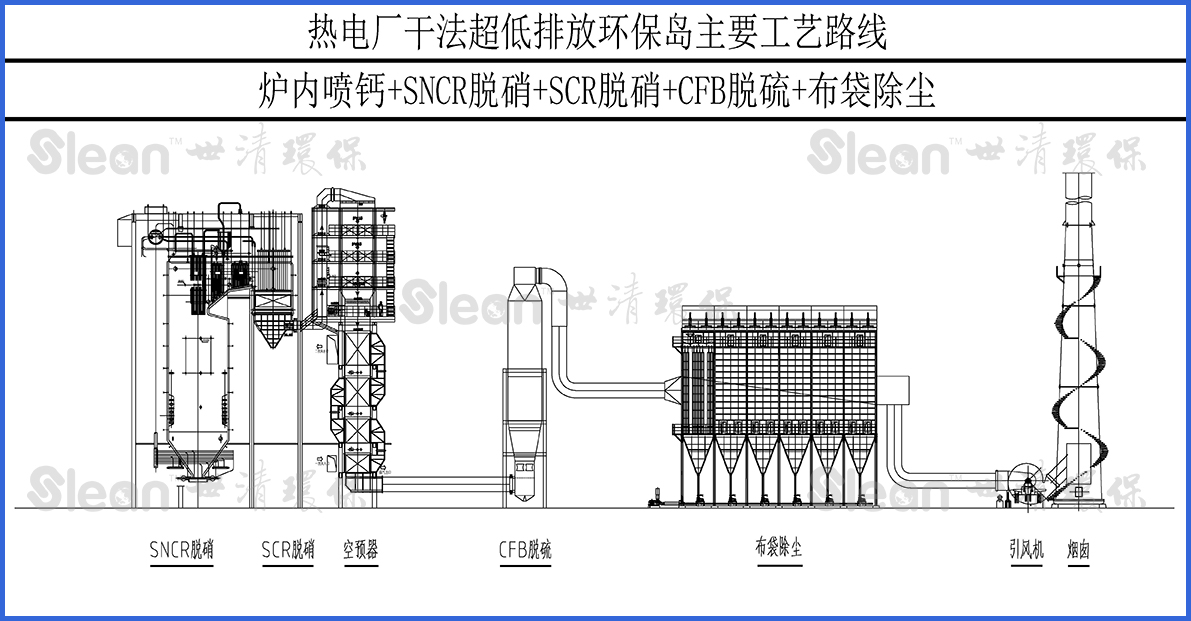 热电厂基本为燃煤机组,根据煤质来源不同,分为高硫煤、低硫煤,煤炭经过燃烧高温分解产生的主要污染物有SO2/NOX、粉尘等,在水源缺少地区,干法超低排净工艺应用更多,相比湿法,干法耗水量低,同时也没有废水产生。目前主要用的工艺是炉内喷钙+SNCR+CFB循环流化床脱硫工艺。