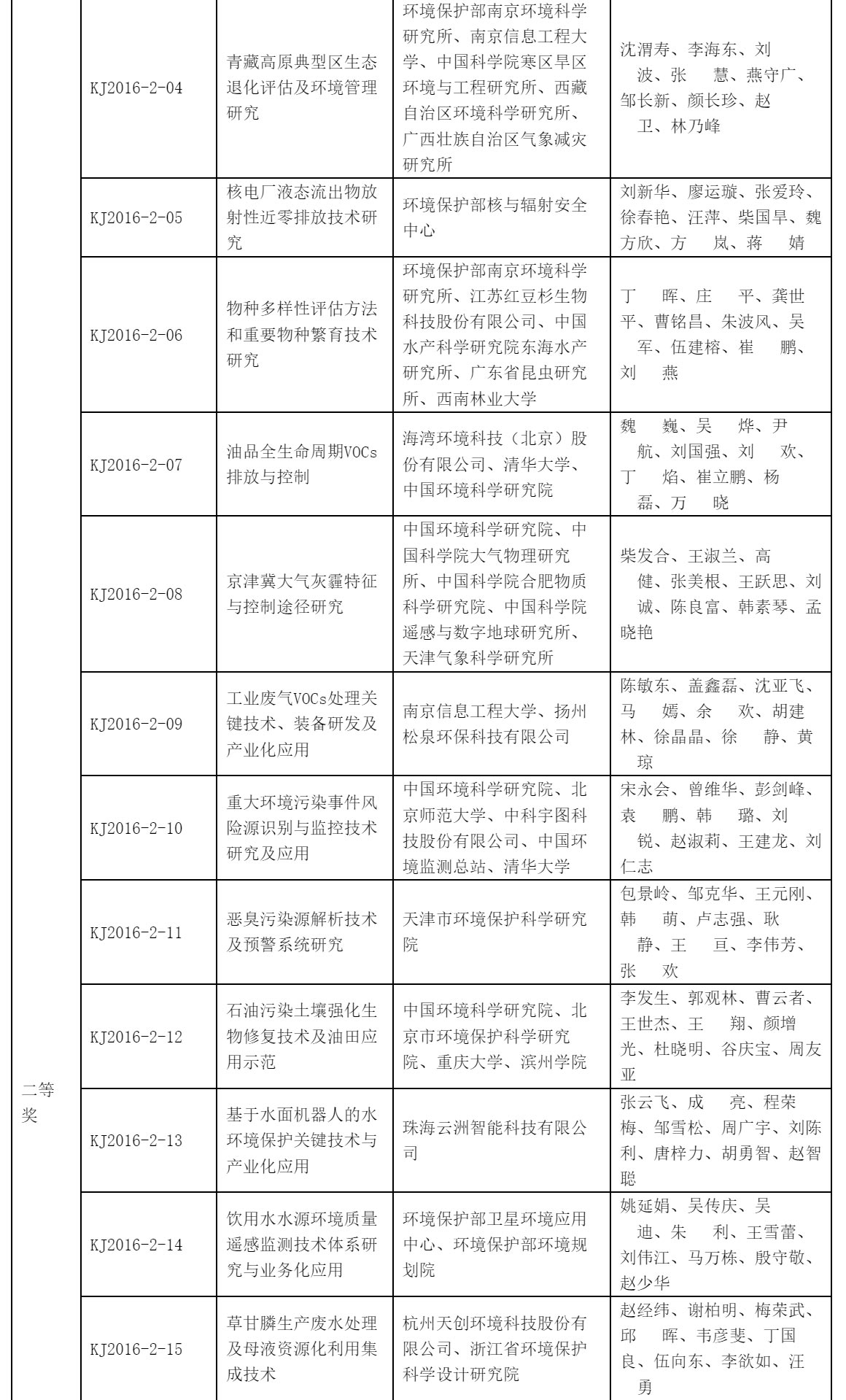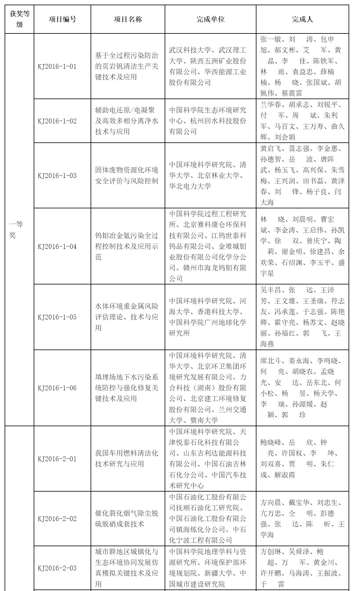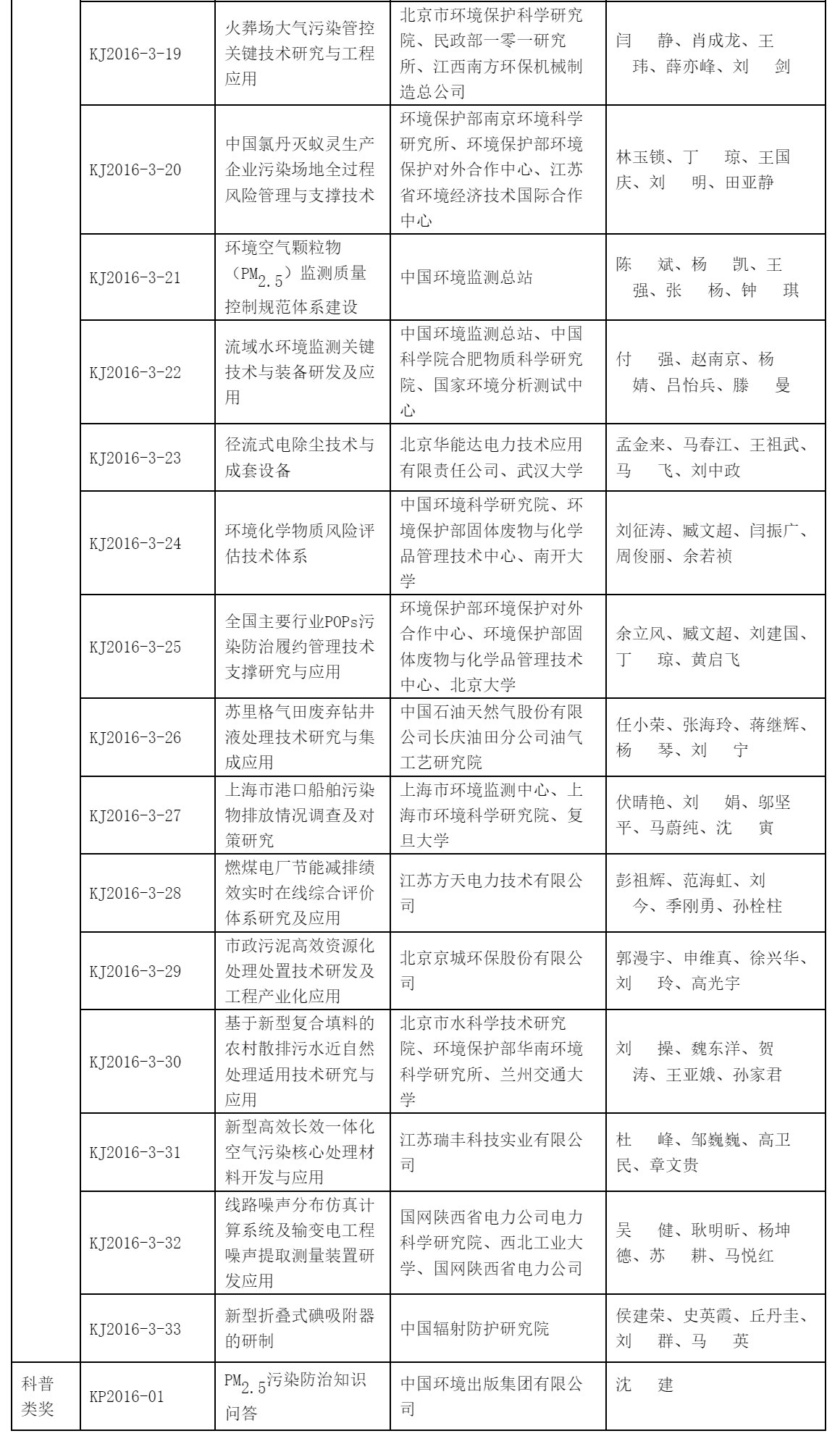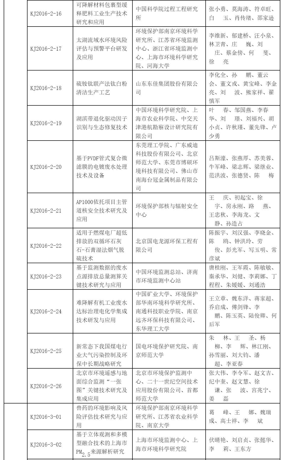 附件:2016年度环境保护科技奖拟授奖项目公示名单
