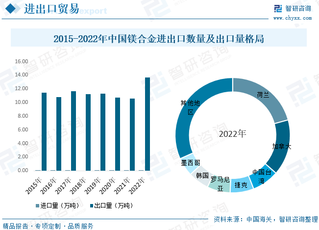 我国作为全球主要原镁生产国,也是重要的镁资源出口国。大力推进镁合金工业化应用,不仅是结构材料轻量化、保护环境的重要举措,也是充分利用我国丰富的资源、缓解对铁铝矿资源进口依赖的重要举措,特别是在复杂多变的国际形势下具有极其重要的战略意义。据统计,2022年我国镁合金出口增多,出口量为13.67万吨,同比增长29.6%;从出口目的地来看,2022年我国镁合金主要出口前往荷兰、加拿大、中国台湾、捷克等地区。