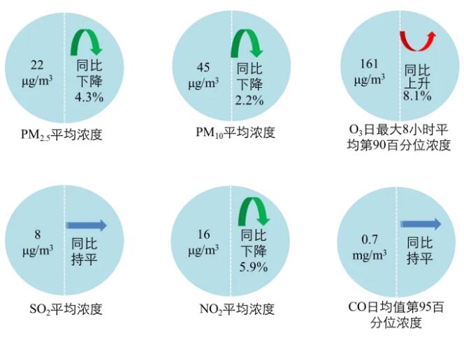 5月,全国339个地级及以上城市PM2.5平均浓度为22微克/立方米,同比下降4.3%;PM10平均浓度为45微克/立方米,同比下降2.2%;O3平均浓度为161微克/立方米,同比上升8.1%;SO2平均浓度为8微克/立方米,同比持平;NO2平均浓度为16微克/立方米,同比下降5.9%;CO平均浓度为0.7毫克/立方米,同比持平。