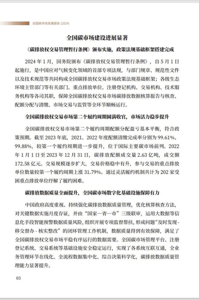 为促进社会各界更好了解全国碳市场发展情况,生态环境部组织编制了《全国碳市场发展报告(2024)》,并于7月21日在武汉“中国碳市场大会2024”上正式发布。
